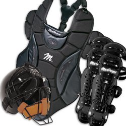 A great value, this set of catchers gear includes everything your young ballplayer needs to strap in and settle down behind the plate. This catchers gear set includes a catchers combo helmet/mask, throat guard, youth chest protector, and youth double knee guards. The MacGregor Youth catchers gear set is available in your choice of colors.
