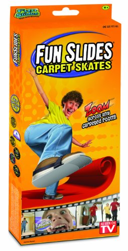 Just like socks on a hardwood floor FunSlides give you that same fun-powered-glide on carpet. When an indoor activity is needed, children will forget about the rainy day and strap on these cool new skates to participate in the newest carpet craze| Simply strap the friction-resistant plastic bases over your athletic shoes and go. The toe grips make it easy to push off and safe to walk in. One size fits all so adults can get on the action too. Use the carpet puck for indoor street hockey tourneys.